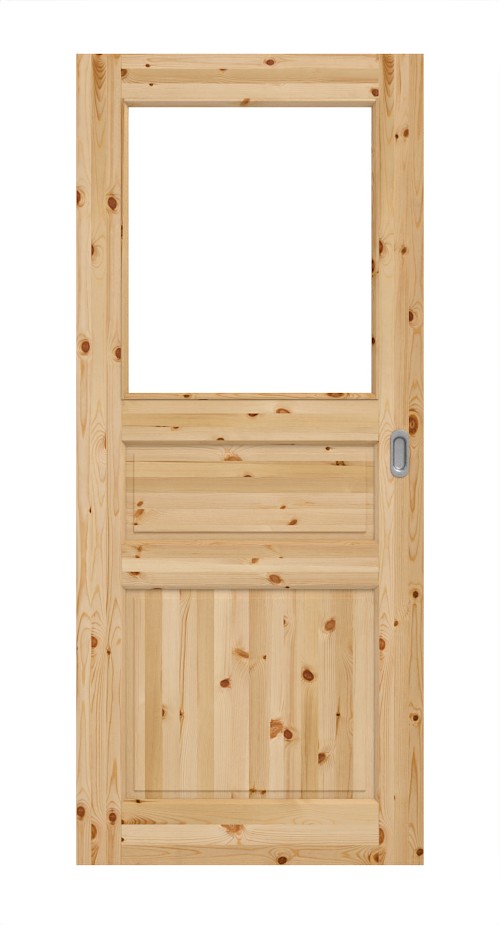 Skrzydło drzwiowe składa się z trzech elementów. W górnej części znajduje się otwór świetlny, który zapewnia jasność w Twoim pomieszczeniu. Poniżej znajdują się dwie różnej wielkości wypełnienia. Profilowana listwa drzwiowa nadaje drzwiom przesównym rustykalny design. Powierzchnia drewna jest opcjonalnie nieobrobiona lub pokryta bezbarwnym lakierem. Surowa powierzchnia ma tę zaletę, że możesz samodzielnie pomalować drzwi. Bezbarwny lakier podkreśla szczególnie dobrze usłojenie drewna.