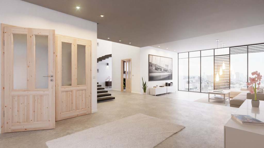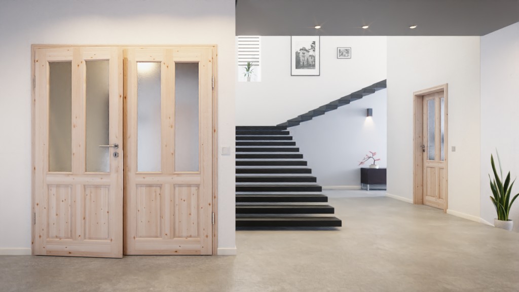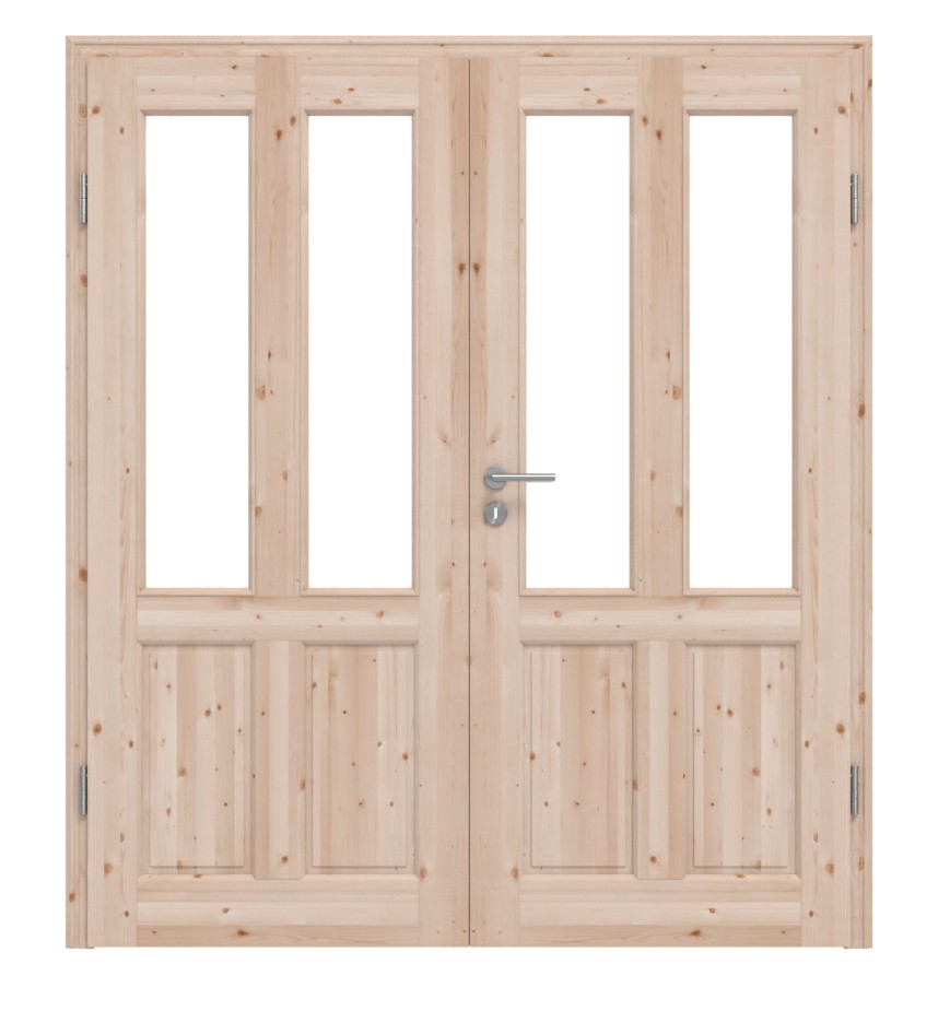 Każde skrzydło drzwi składa się z czterech elementów. Dwa długie otwory świetlne rozciągają się pionowo na prawie dwie trzecie powierzchni, wpuszczając światło do wnętrza. Resztę uzupełniają dwa mniejsze wypełnienia. Profilowane fryzy drzwiowe nadają odpowiednie akcenty w stylu wiejskim. Naturalny wygląd zapewnia bezbarwne lakierowanie powierzchni. Alternatywnie można wybrać surową powierzchnię, aby samodzielnie ją zaaranżować.