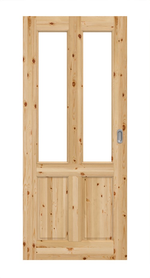 W tym skrzydle drzwiowym znajdują się cztery elementy. Dwa długie otwory świetlne rozciągają się pionowo na prawie dwie trzecie powierzchni, wpuszczając światło do pomieszczenia. Resztę uzupełniają dwa mniejsze wypełnienia. Profilowany fryz drzwiowy nadaje drzwiom przesuwanym rustykalny design. Powierzchnia drewna jest opcjonalnie nieobrobiona lub pokryta bezbarwnym lakierem. Surowa powierzchnia ma tę zaletę, że można samodzielnie pomalować drzwi. Bezbarwny lakier z kolei doskonale podkreśla usłojenie drewna.