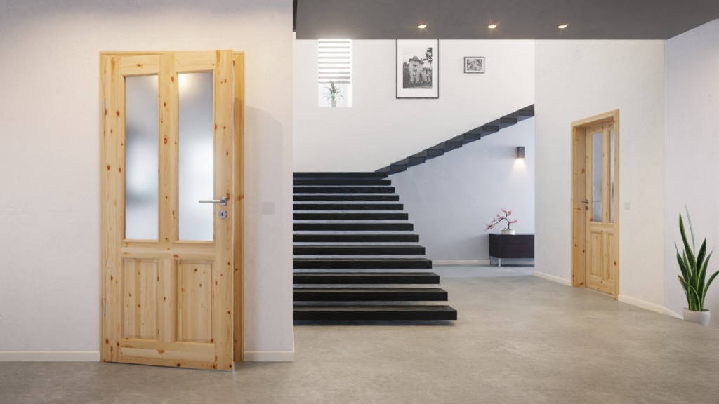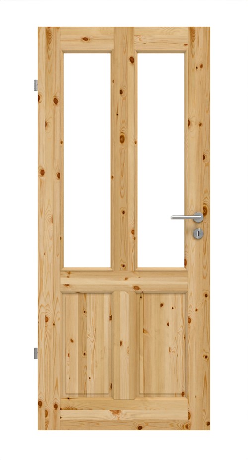 W tym skrzydle drzwiowym znajdują się cztery elementy. Dwa podłużne otwory świetlne rozciągają się pionowo na prawie dwie trzecie powierzchni, wpuszczając światło do Twojego wnętrza. Reszta uzupełniona jest przez dwa mniejsze wypełnienia. Dodatkowo drzwi mają profilowany fryz drzwiowy, który znacząco przyczynia się do wiejskiego charakteru.