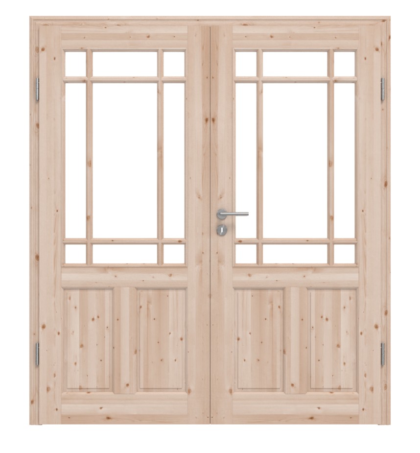Ramka z przegrodami w górnej części każdego skrzydła drzwi dzieli się na dziewięć pól, co nadaje sekcji interesujący charakter. Dzięki temu wpada światło. Poniżej ramki znajdują się dwa małe, pionowe wypełnienia, które podkreślają tradycyjny ogólny charakter. Dodatkowo posiada profilowane fryzy drzwiowe, które znacząco przyczyniają się do wiejskiego wyglądu. Do tego dochodzą wycięcia na światło z dyskretnymi przegrodami. Nieobrobiona powierzchnia idealnie nadaje się do nadania drzwiom pożądanego wyglądu za pomocą ulubionego lakieru. Twojej wyobraźni nie ma granic. Możesz również zdecydować się na bezbarwną lakierowanie. To szczególnie podkreśla usłojenie drewna.