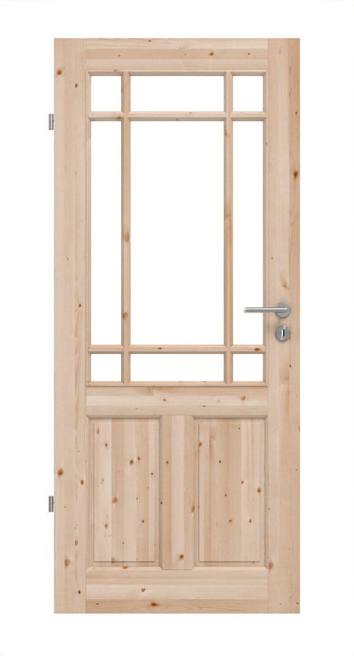Ramka z przegrodami w górnej części skrzydła drzwi dzieli się na dziewięć pól, co nadaje sekcji interesujący charakter. Jednocześnie wpuszcza światło do wnętrza. Poniżej ramki znajdują się dwie małe, pionowe wypełnienia, które podkreślają tradycyjny charakter całości. Profilowany fryz drzwiowy zapewnia typowy wygląd wiejskiego domu.