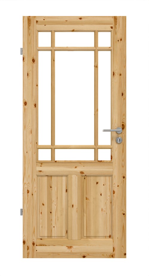 Ramka z przegrodami w górnej części skrzydła drzwi dzieli się na dziewięć pól, co nadaje sekcji interesujący charakter. Jednocześnie wpuszcza światło do wnętrza. Poniżej ramki znajdują się dwie małe, pionowe wypełnienia, które podkreślają tradycyjny charakter całości. Profilowany fryz drzwi nadaje drzwiom wewnętrznym wyjątkowego stylu. Wykonanie w prostej, jednowarstwowej konstrukcji ramowej zapewnia solidną stabilność.