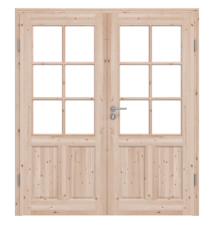 Górna rama składa się z sześciu kwadratowych okienek świetlnych, oddzielonych drewno-słupkami. Dodatkowo, każde skrzydło drzwiowe ma dwa pionowe kasetony w dolnej części. Przy szerokości drzwi powyżej 1720 mm skrzydła drzwiowe mają po 9 słupkach.
