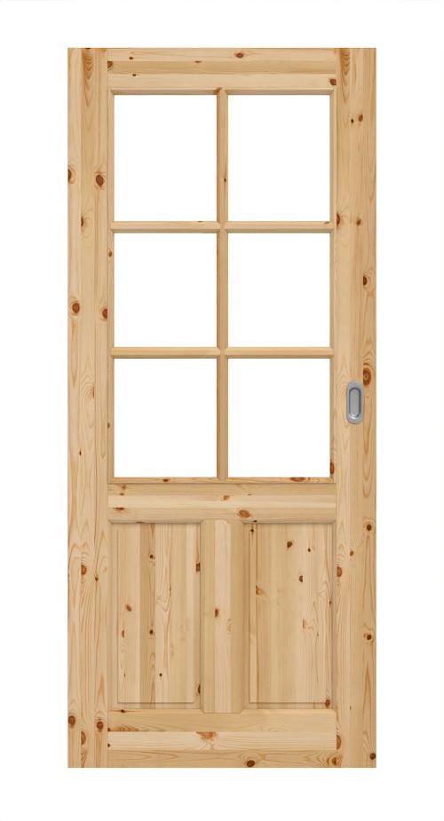 Górna rama składa się z sześciu kwadratowych okienek świetlnych, oddzielonych drewienkami. Dodatkowo w dolnej części skrzydła drzwi znajdują się dwie pionowe kasety. Przy szerokości drzwi od 860 mm skrzydło drzwiowe ma 9 drewnianych listew.