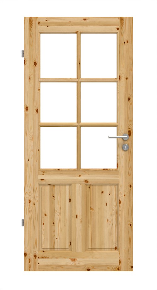 Górna rama składa się z sześciu kwadratowych okienek świetlnych, oddzielonych drewienkami. Dodatkowo znajdują się dwie pionowe kasety w dolnej części skrzydła drzwi. Przy szerokości drzwi 860 mm skrzydło drzwiowe ma 9 drewnianych listew.