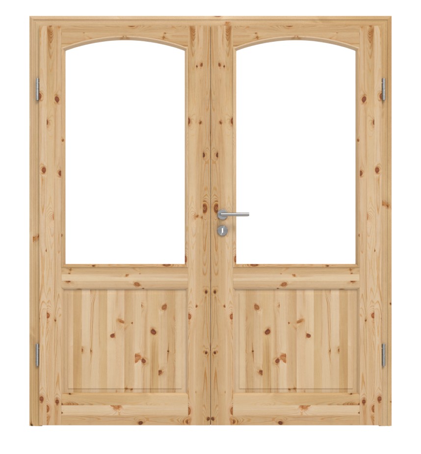 Górny świetlik zajmuje dużą część skrzydła drzwi i ma zaokrąglony łuk na górnym końcu. Wraz z nieco mniejszym wypełnieniem poniżej tworzy tradycyjny ogólny wygląd. Profilowane fryzy drzwiowe nadają drzwiom podwójnym wyjątkowego charakteru. Bezbarwne lakierowanie powierzchni drewna sprawia, że drzwi wiejskie wyglądają szczególnie naturalnie i ciepło. Alternatywnie dostępna jest również surowa powierzchnia. Możesz samodzielnie zaprojektować swój indywidualny wygląd poprzez własne lakierowanie.