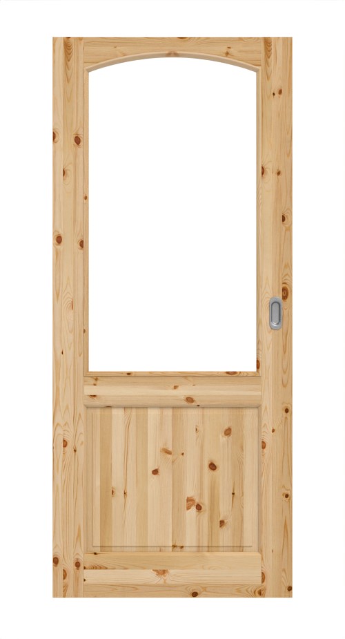 Górny otwór świetlny zajmuje dużą część skrzydła drzwi i ma zaokrąglony łuk na górnym końcu. Wraz z nieco mniejszym wypełnieniem poniżej tworzy tradycyjny ogólny wygląd. Profilowany fryz drzwiowy nadaje drzwiom przesuwanym rustykalny design. Powierzchnia drewna jest opcjonalnie nieprzetworzona lub pokryta bezbarwnym lakierem. Surowa powierzchnia ma tę zaletę, że można samodzielnie pomalować drzwi. Bezbarwny lakier szczególnie dobrze uwydatnia usłojenie drewna.