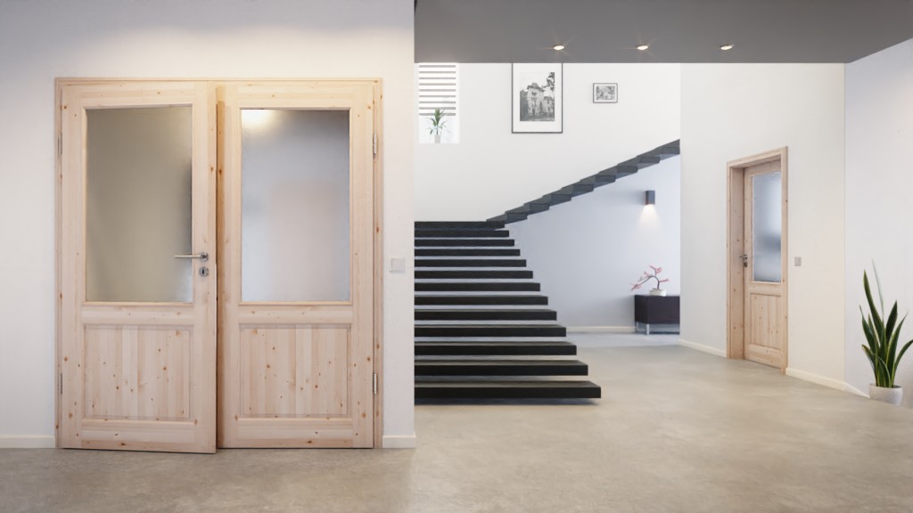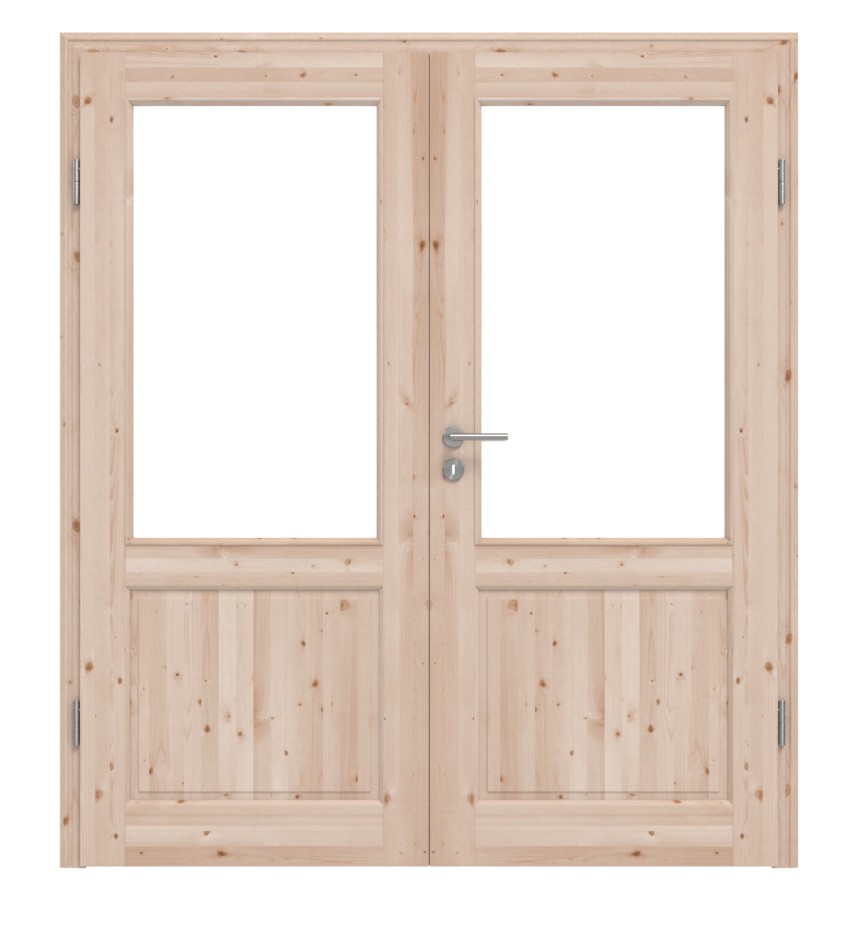 W górnej części skrzydeł drzwiowych znajdują się duże przeszklenia, które wpuszczają światło do Twojego pomieszczenia. Poniżej znajduje się prostokątna wypełnienie. Typowy wiejski wygląd zapewniają profilowane fryzy drzwiowe. Powierzchnia jest dostępna w wersji lakierowanej lub surowej. Dzięki lakierowanej powierzchni struktura litego drewna jest szczególnie dobrze widoczna. Surowa warstwa wierzchnia ma tę zaletę, że możesz samodzielnie wykonać wykończenie w domu.