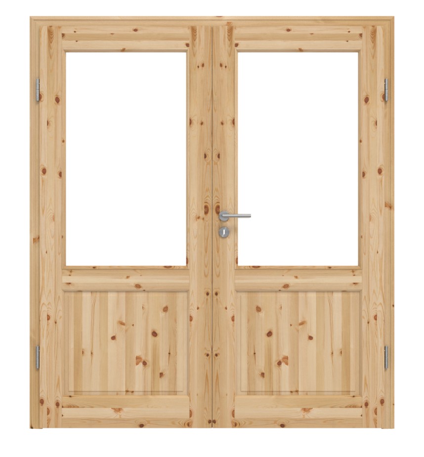 W górnej części skrzydeł drzwi znajdują się duże przeszklenia, które wpuszczają światło do Twojego pomieszczenia. Poniżej znajduje się prostokątna wypełnienie. Profilowane fryzy drzwiowe nadają drzwiom podwójnym wyjątkowy charakter. Bezbarwne lakierowanie powierzchni drewna sprawia, że drzwi wiejskie wyglądają szczególnie naturalnie i ciepło. Alternatywnie dostępna jest również surowa powierzchnia. Możesz samodzielnie zaprojektować swój indywidualny wygląd poprzez własne lakierowanie.