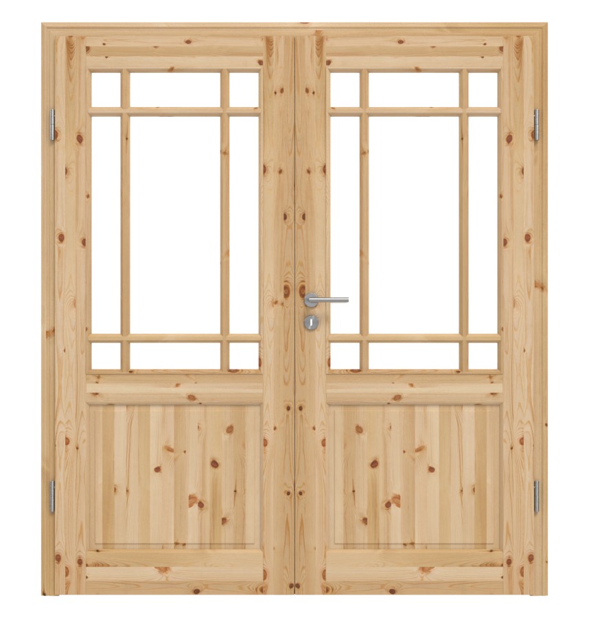Dziewięcioczęściowa rama z drewnianymi szczeblami to prawdziwa ozdoba, która wpuszcza światło do Twojego wnętrza. Każde skrzydło drzwi jest uzupełnione prostokątną wypełnieniem. Profilowane fryzy drzwiowe nadają podwójnym drzwiom wiejski-rustykalny charakter. Szczególnie naturalny wygląd zapewnia bezbarwne lakierowanie, które nadaje powierzchni jedwabisty połysk. Możesz również zdecydować się na nieprzetworzoną powłokę. Dzięki temu powierzchnię można dostosować do własnych potrzeb w domu.