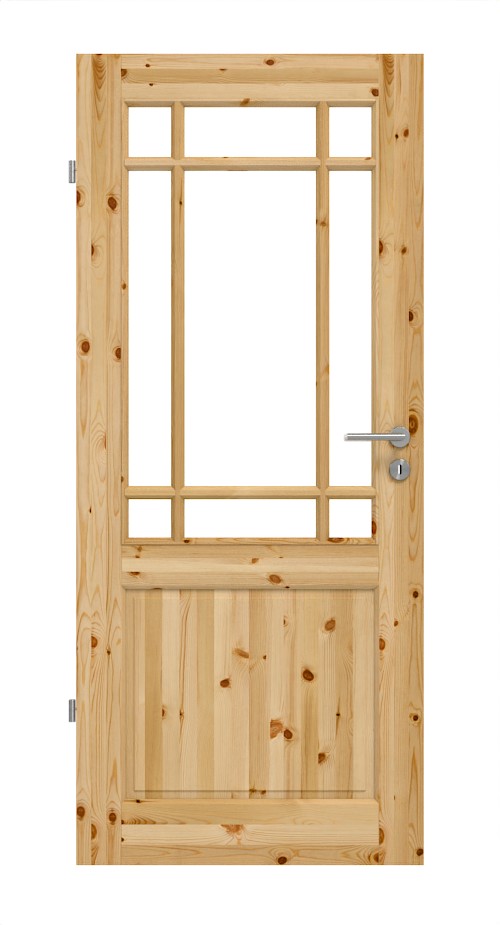 Rama z przegrodami w górnej części skrzydła drzwi dzieli się na dziewięć pól, co nadaje sekcji interesujący charakter. Jednocześnie pozwala na przenikanie światła. Poniżej ramy znajdują się dwie małe, pionowe wypełnienia, które podkreślają tradycyjny charakter całości. Dodatkowo drzwi mają profilowany fryz drzwiowy, który znacząco przyczynia się do wiejskiego wyglądu.