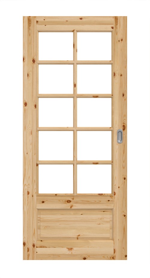 Rama zajmuje niemal całe skrzydło drzwi. Składa się z dziesięciu małych przeszkleń, oddzielonych drewno-słupkami. Poziome wypełnienie dopełnia fascynujący obraz całości. Przy szerokości drzwi od 860 mm skrzydło drzwiowe ma 15 słupków.