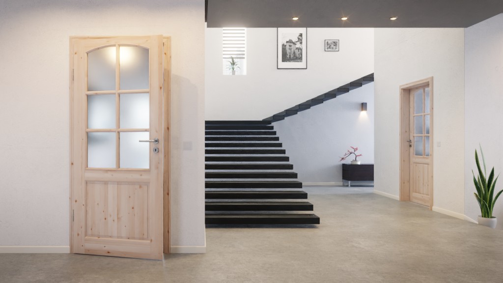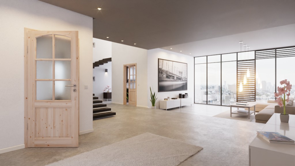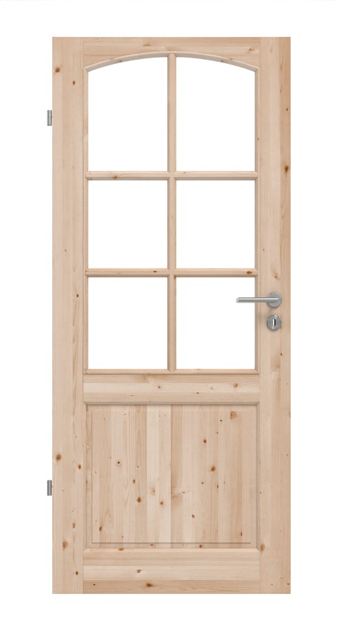 Ramka z przegrodami w górnej części skrzydła drzwi ożywia tradycyjny charakter. Dodatkowo znajduje się mniejsza wypełnienie poniżej, które podkreśla ten wygląd. Przy szerokości drzwi od 860 mm skrzydło drzwiowe ma 9 przegrod.