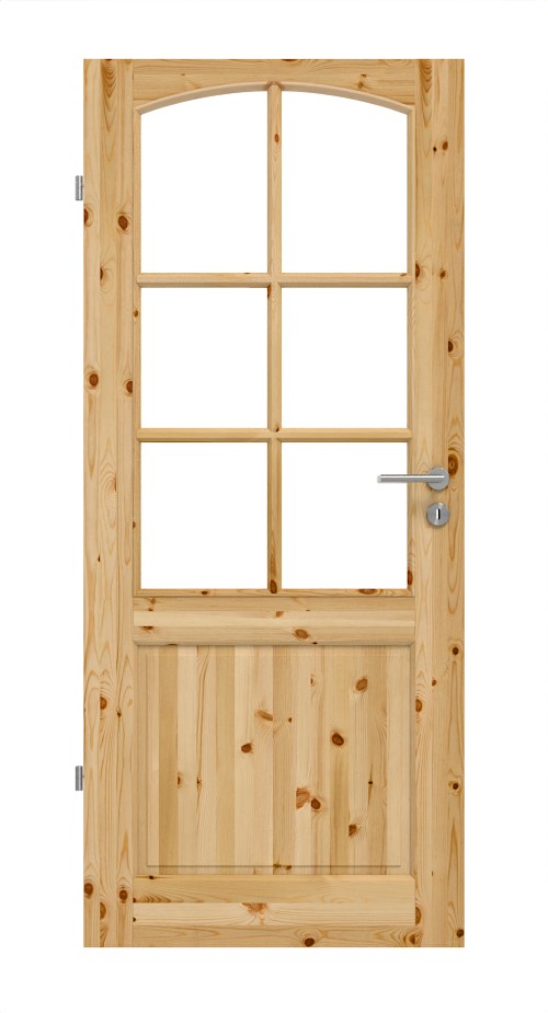 Ramka z przegrodami w górnej części skrzydła drzwi ożywia tradycyjny charakter. Dodatkowo znajduje się mniejsza wypełnienie poniżej, które podkreśla ten wygląd. Przy szerokości drzwi od 860 mm skrzydło drzwiowe ma 9 przegrod.