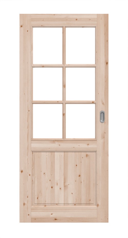 W górnej części skrzydła drzwi znajduje się rama z drewnianymi szczeblami, która dzieli przeszklenie na sześć kwadratów. Poniżej znajduje się prostokątna wypełnienie. Przy szerokości drzwi od 860 mm skrzydło drzwiowe ma 9 szczebli.