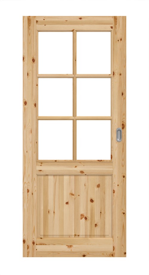 W górnej części skrzydła drzwi znajduje się rama z drewnianymi szczeblami, która dzieli przeszklenie na sześć kwadratów. Poniżej znajduje się prostokątna wypełnienie. Dodatkowo ma profilowany fryz drzwiowy, który znacząco przyczynia się do wiejskiego charakteru. Jest też przeszklenie z subtelnymi szczeblami. Przy szerokości drzwi od 860 mm skrzydło drzwiowe ma 9 szczebli.