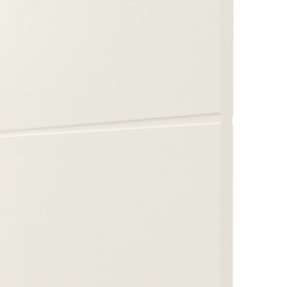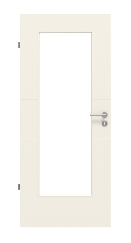 Skrzydło drzwi z dwoma centralnie umieszczonymi poziomymi rowkami jest przerywane przez dużą prostokątną szybę. Dzięki temu do pomieszczeń wpada dużo światła, a delikatne detale nadają nowoczesny wygląd.