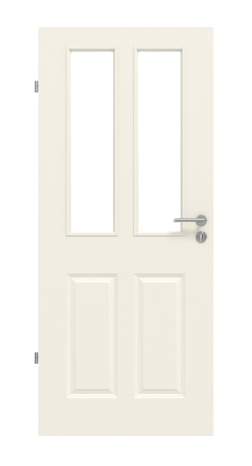 Cztery wąskie elementy prostokątne są typowo osadzone w drzwiach w stylu rzemieślniczym. Górne elementy są dodatkowo wyposażone w szklane elementy, co wprowadza klasyczną, jasną atmosferę do Twoich pomieszczeń.