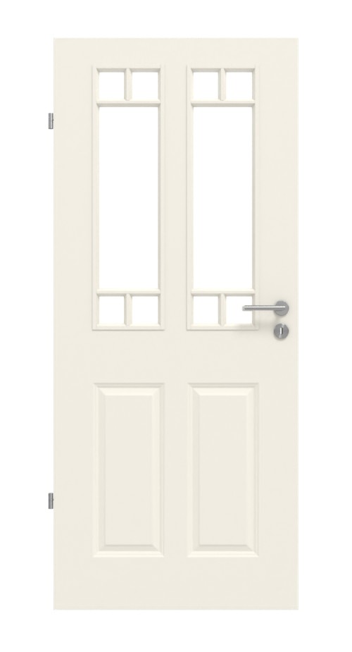 Tradycyjny styl wiejski szczególnie dobrze uwidacznia się dzięki efektownie zaprojektowanemu przeszkleniu w górnej części drzwi. Wraz z prostokątnymi wypełnieniami w dolnej części tworzy jednolity, naturalny wygląd.