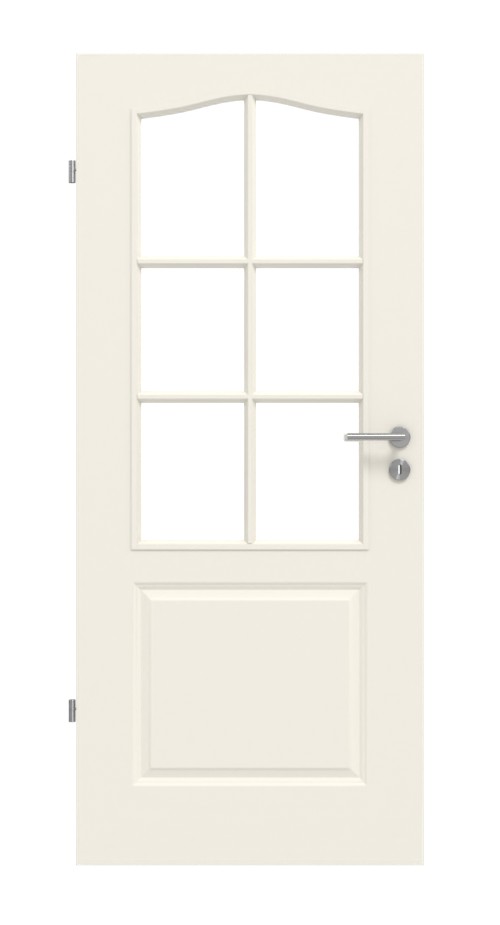Powierzchnia drzwi jest zdominowana przez profilowaną optykę, która przypomina tradycyjne rzemiosło stolarskie. Łuk 6-szybowego okna w powierzchni drzwi nadaje klasycznej drewnianej estetyce zabawny akcent. Przy szerokości drzwi 860 mm skrzydło drzwiowe ma 9 szyb.