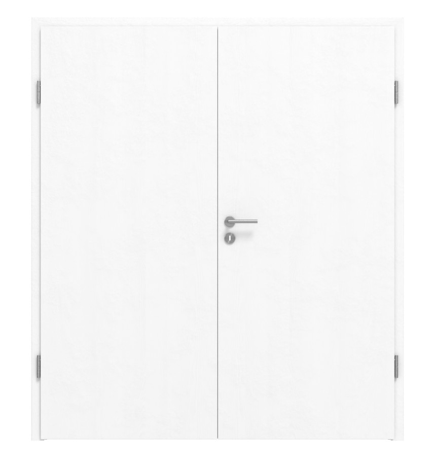 W jednolitych, płaskich skrzydłach drzwiowych widoczne są słoje drewna, które dyskretnie prześwitują przez biały kolor. Dzięki temu te dwuskrzydłowe drzwi zyskują naturalny, świeży, a jednocześnie ponadczasowy wygląd.