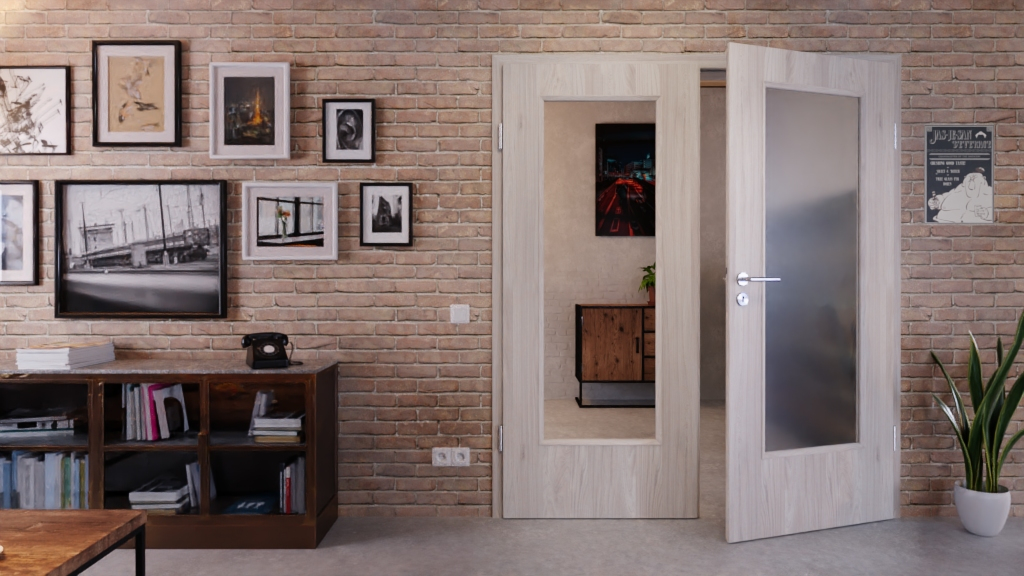 Design z dębu zyskuje tutaj delikatny odcień szarości, który podkreśla linearne usłojenie skrzydeł drzwi. W tę liniową formę doskonale wpisują się duże, prostokątne przeszklenia, tworząc nowoczesną interpretację klasycznych drzwi drewnianych.