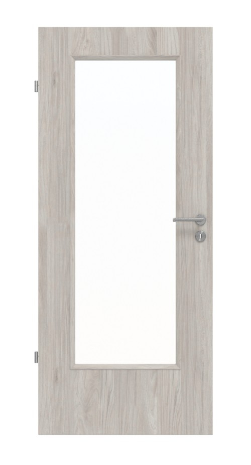 Design z dębu zyskuje tutaj lekki odcień szarości, który podkreśla liniowy rysunek skrzydła drzwi. W tę liniową formę doskonale wpisuje się duże, prostokątne przeszklenie, co tworzy nowoczesną interpretację klasycznych drzwi drewnianych.