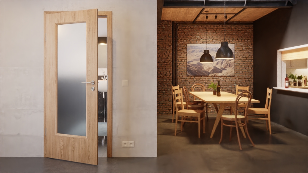 Charakterystyczny wzór drewna jest tutaj wyraźnie widoczny, nadając pomieszczeniom szczególnie naturalny charakter. Ciemnobrązowy kolor jest przełamany przez obszerny przeszklenie, co sprawia, że te drzwi są jednocześnie nowoczesne i rustykalne.