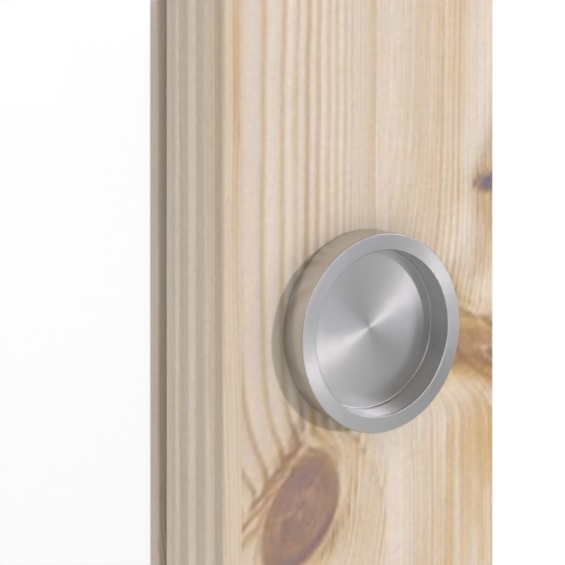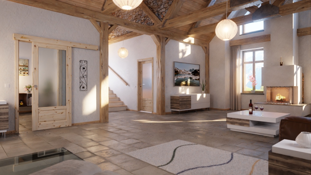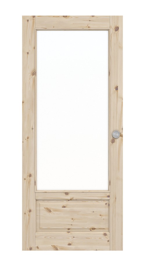 Duże przeszklenie zajmuje około dwóch trzecich skrzydła drzwiowego i zapewnia jasność w pomieszczeniu. Pod spodem znajduje się mniejsze, prostokątne wypełnienie. Profilowana listwa drzwiowa podkreśla rustykalny styl drzwi przesuwnych.