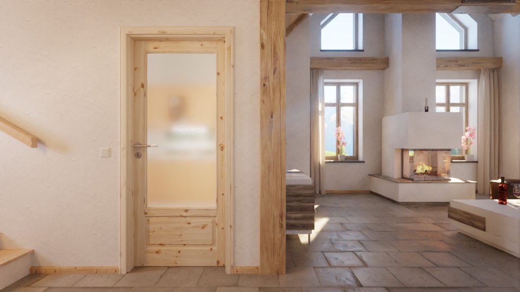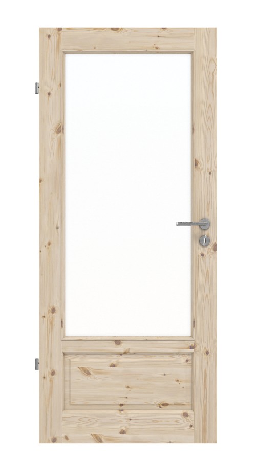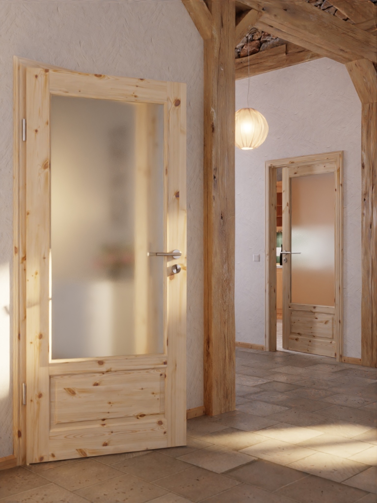 Duże przeszklenie zajmuje około dwóch trzecich skrzydła drzwiowego i zapewnia jasność w pomieszczeniu. Pod spodem znajduje się mniejsze, prostokątne wypełnienie. Profilowana listwa drzwiowa podkreśla rustykalny styl drzwi wewnętrznych.