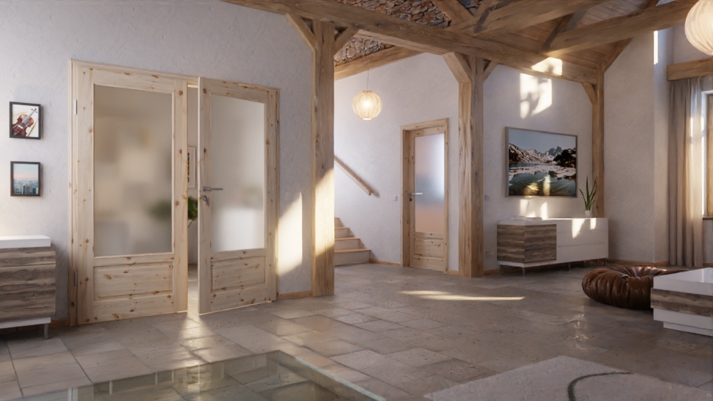 Dwa duże przeszklenia, zajmujące prawie całą powierzchnię skrzydeł drzwiowych, zapewniają więcej światła i tworzą przyjemną atmosferę. Rustykalny charakter dopełnia kaseta w dolnej części oraz klasyczny, profilowany fryz drzwiowy.