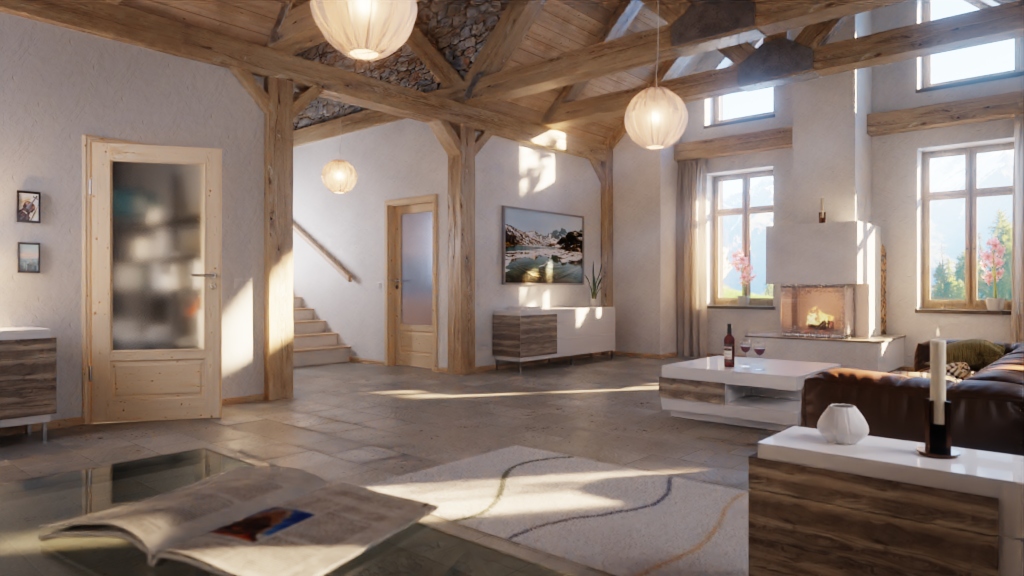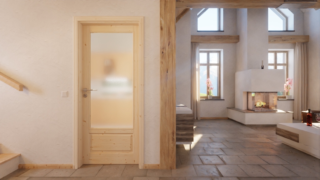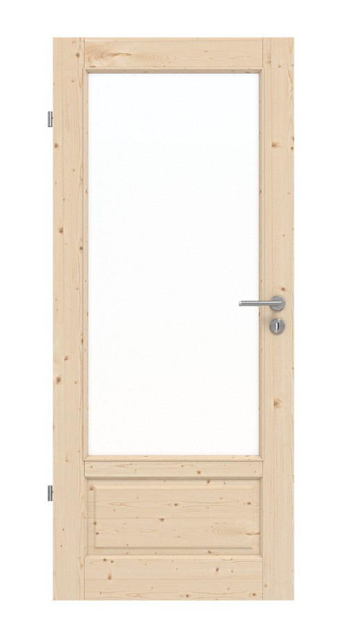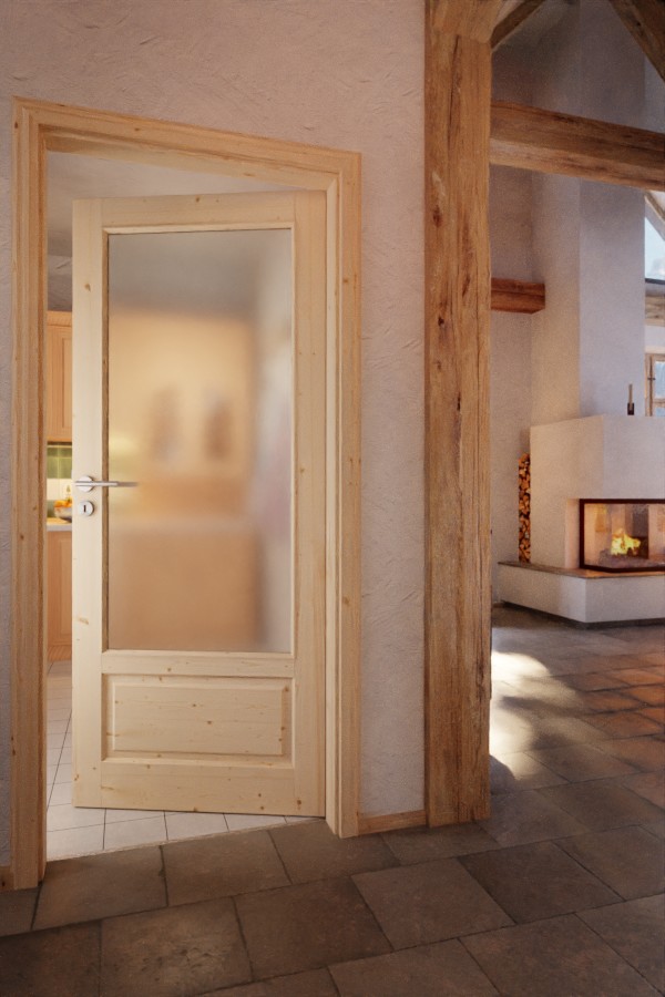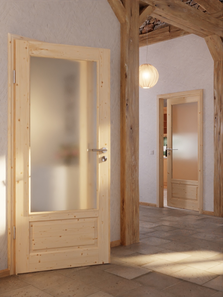 Duży przeszklenie zajmuje około dwie trzecie skrzydła drzwiowego i wpuszcza więcej światła do pomieszczenia. Pod nim znajdują się dwie mniejsze prostokątne wypełnienia. Wiejski styl jest nastrojowo podkreślony profilowanym fryzem drzwiowym.
