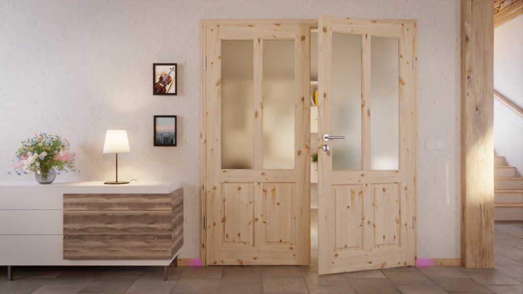 Dwa prostokątne, pionowe przeszklenia w skrzydłach drzwiowych są podzielone pośrodku rustykalnymi drewnianymi szprosami. Światło i jasność wpadają do pomieszczenia, tworząc nastrojową atmosferę. Dwa kolejne prostokątne wypełnienia są umieszczone poniżej. Dodatkowy klimat stylu wiejskiego zapewnia profilowana listwa drzwiowa.