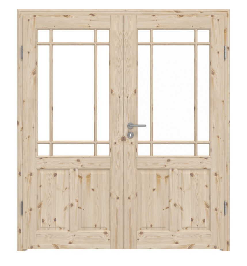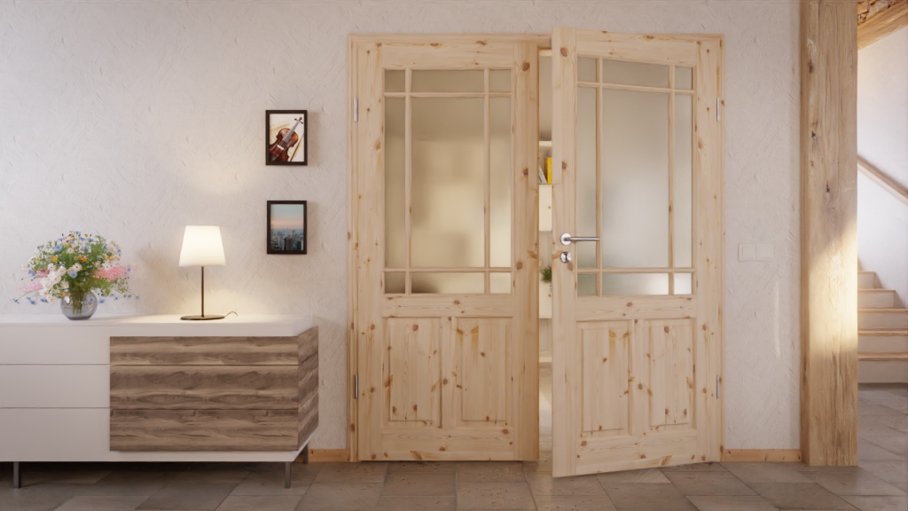 Podwójna radość z mieszkania: Podwójne drzwi z litego drewna w stylu wiejskim 6002-04-SF9, wykonane z sosny sękatej, nadadzą Twojemu pomieszczeniu naturalnego połysku.