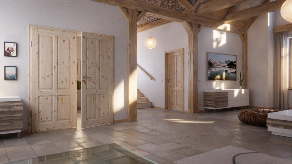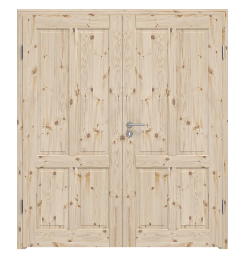 Podwójna naturalność mieszkania: Podwójne drzwi z litego drewna w stylu wiejskim typu Landhaus 6002-04, wykonane z sosny sękatej, nadadzą Twojemu pomieszczeniu naturalny charakter.