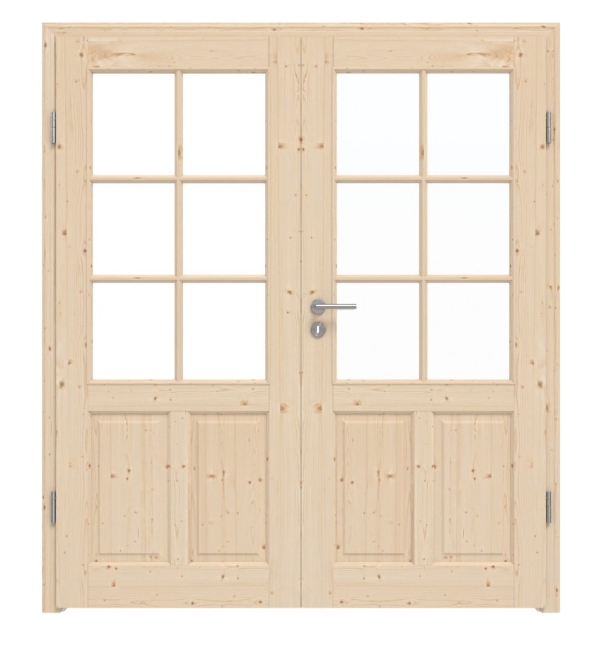 Rustykalne wrażenie domowe w podwójnym wydaniu: Podwójne skrzydło drzwi z litego drewna typu wiejskiego 6002-04-SP6 z sosny sękatej od firmy Radex wnosi autentyczność i harmonię do Twojego domu.