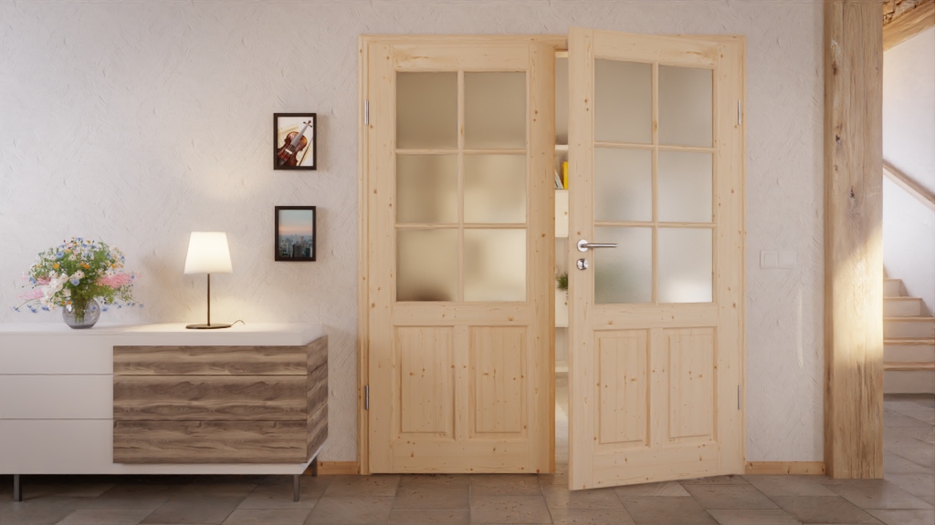 Podwójne drzwi skrzydłowe przyciągają wzrok swoją zapraszającą i otwartą formą. Odpowiadają za to dwa duże okna świetlne, podzielone na sześć równych części przez drewniane listwy. Dwie mniejsze wypełnienia znajdują się poniżej. Eleganckim uzupełnieniem jest profilowany fryz drzwiowy.