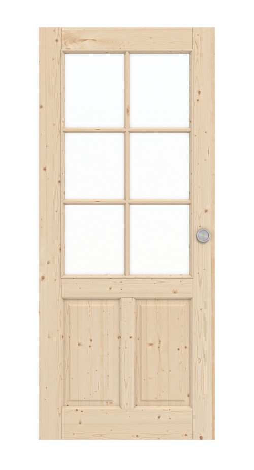 Sześć jednakowych przeszkleń dzieli górną część skrzydła drzwi i wpuszcza światło do pomieszczenia. Dwie pionowe kasety znajdują się poniżej. Profilowany fryz drzwiowy skutecznie nawiązuje do stylu wiejskiego.