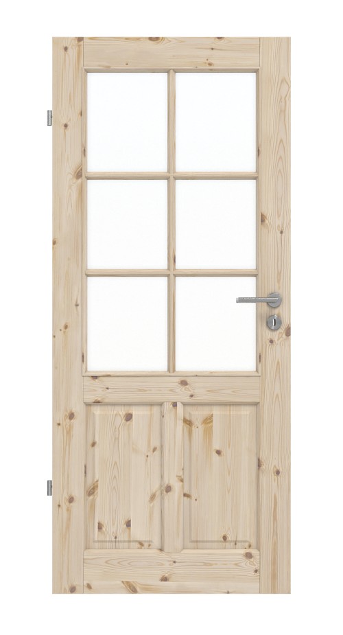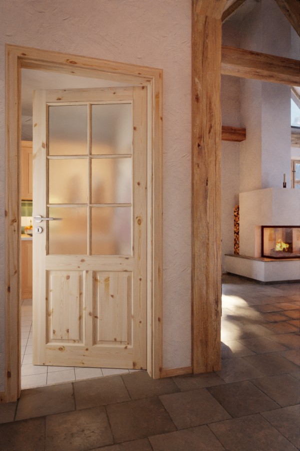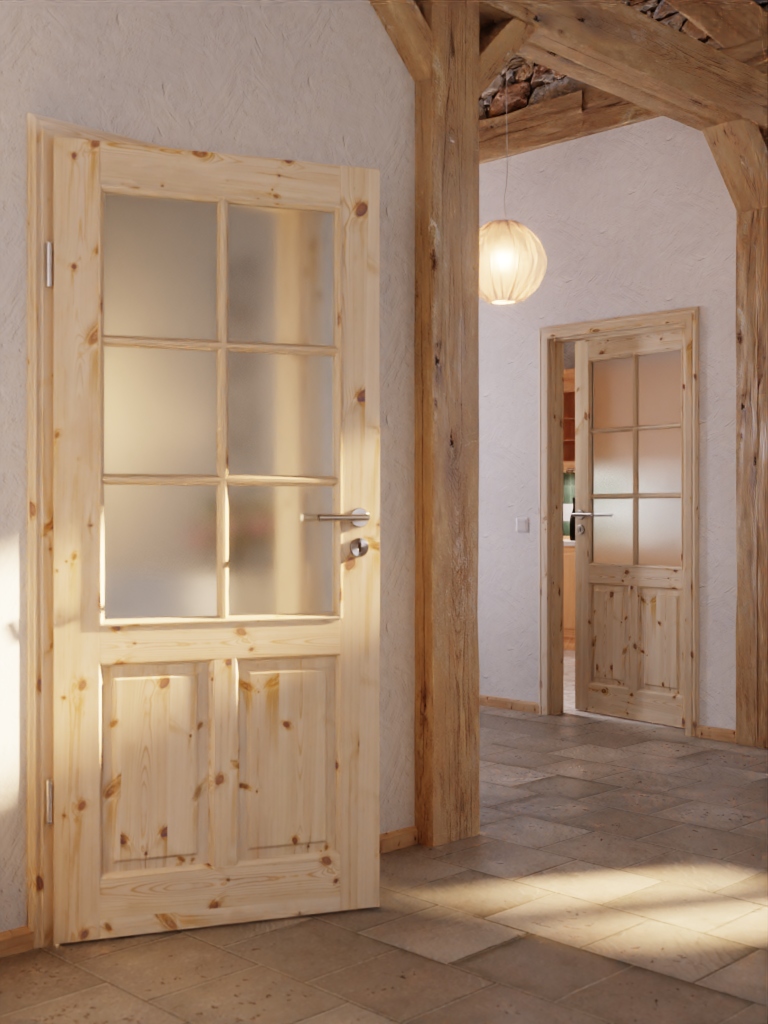 Rama z prętami dzieli górną część skrzydła drzwiowego na sześć równych przeszklień, które wpuszczają światło do pomieszczenia. W dół znajdują się dwa pionowe kasety. Profilowana listwa drzwiowa nastrojowo nawiązuje do stylu wiejskiego.
