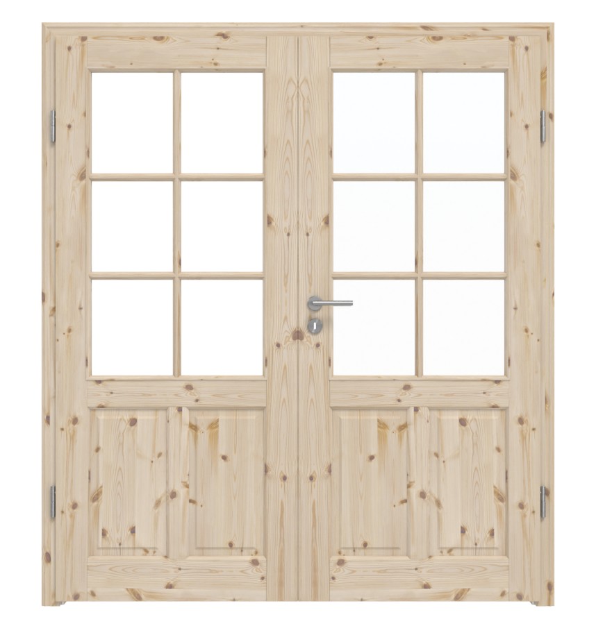 Atrakcją drzwi dwuskrzydłowych są dwa duże przeszklenia, które dzięki drewnianym szprosom podzielone są na sześć powierzchni i zapewniają przyjemną jasność w pomieszczeniu. Dwie dodatkowe kasety oraz profilowana listwa drzwiowa zaokrąglają styl wiejski wnętrza.