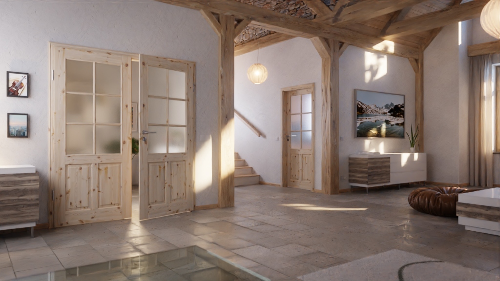 Podwójna naturalność mieszkania: Drzwi podwójne z litego drewna w stylu wiejskim typu 6002-04-SP6 z sosny sękatej firmy Radex sprawiają, że mieszkanie staje się jeszcze bardziej przytulne.