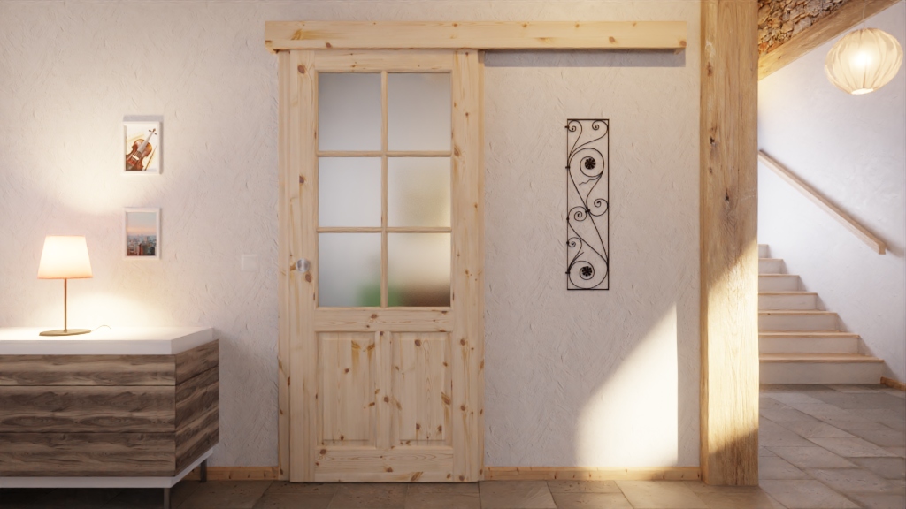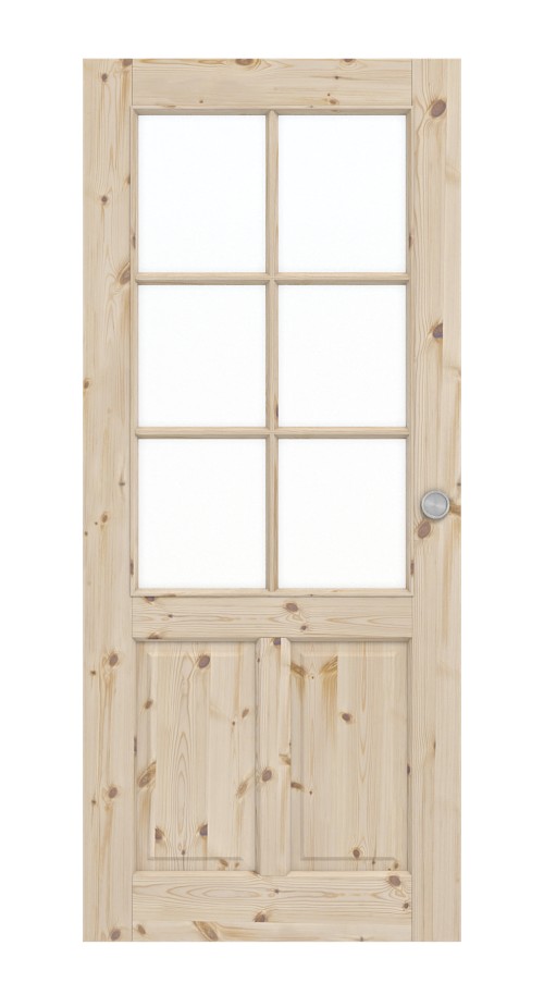 Rama z prętami dzieli górną część skrzydła drzwiowego na sześć równych przeszklień, które wpuszczają światło do pomieszczenia. W dół znajdują się dwa pionowe kasety. Profilowana listwa drzwiowa nastrojowo nawiązuje do stylu wiejskiego.