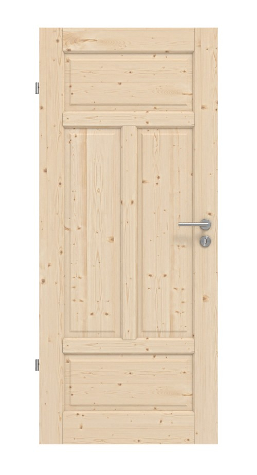 Skrzydło drzwiowe podzielone jest na trzy części. Dwa poziome wypełnienia, na górze i na dole, otaczają dwie pionowe kasety w środku. Klasyczny wiejski wygląd zapewnia również profilowana rama drzwi.