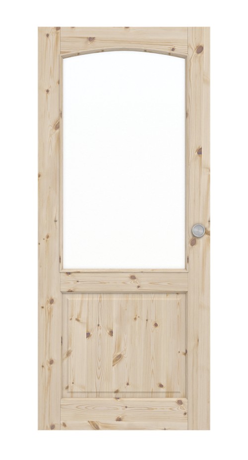 Górną część zajmuje duży otwór świetlny z łukowatym wygięciem. W dolnej części znajduje się kolejna kaseta z mniejszym wypełnieniem. Tradycyjny styl wiejski uzupełnia profilowana listwa drzwiowa.