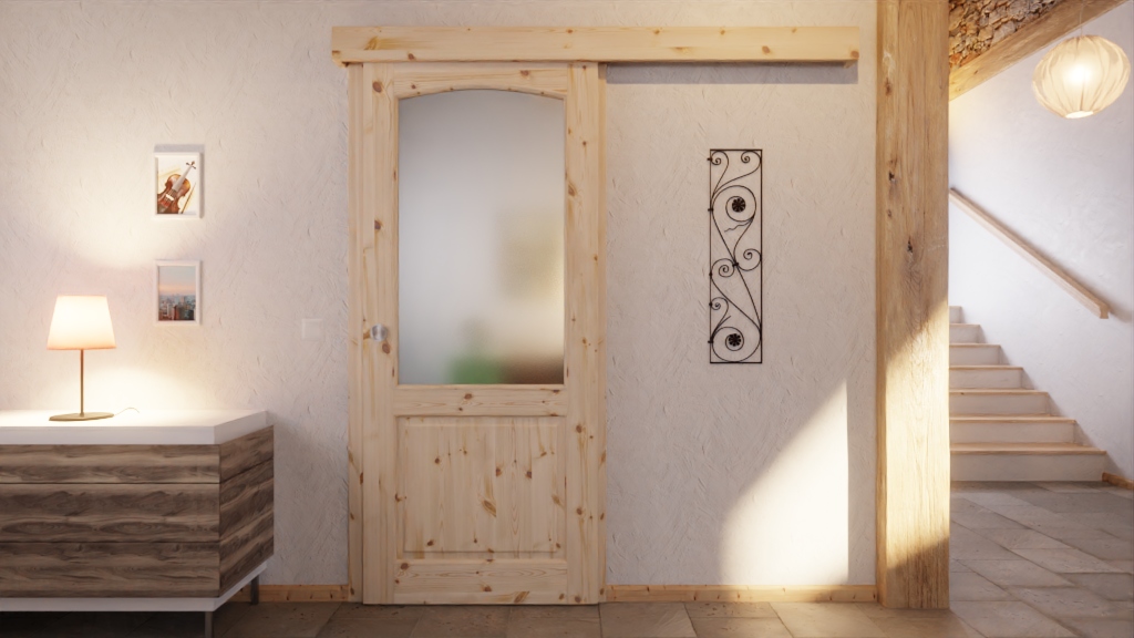 Tradycyjny urok i efektywny design: Drewniane drzwi przesuwne typu 6002-B-LA z sosny sękatej firmy Radex nadają pomieszczeniom klasyczny charakter.