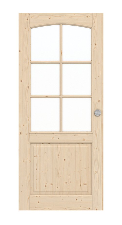 Przestronny otwór świetlny z zaokrąglonym łukiem na górze definiuje skrzydło drzwi. Drewniane listwy dzielą otwór na sześć kwadratów. Profilowany fryz drzwiowy podkreśla tradycyjny wygląd drzwi.