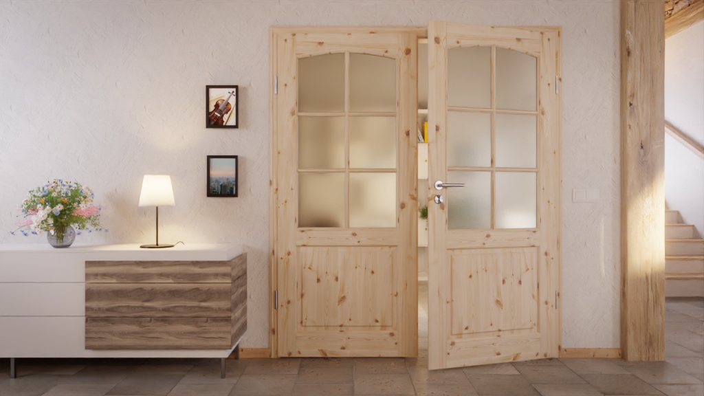 Podwójna naturalność mieszkania: Drzwi podwójne z litego drewna w stylu wiejskim 6002-B-LA SPR 62 z sosny sękatej producenta Radex łączą w sobie stylowy, klasyczny wygląd z przytulnością.