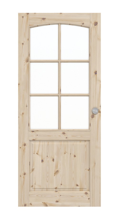 Skrzydło drzwiowe posiada duże przeszklenie z łukowatym wycięciem w górnej części. Drewniane szprosy dzielą wycięcie na sześć kwadratów. Profilowana listwa drzwiowa podkreśla tradycyjne wykończenie wizualne drzwi.