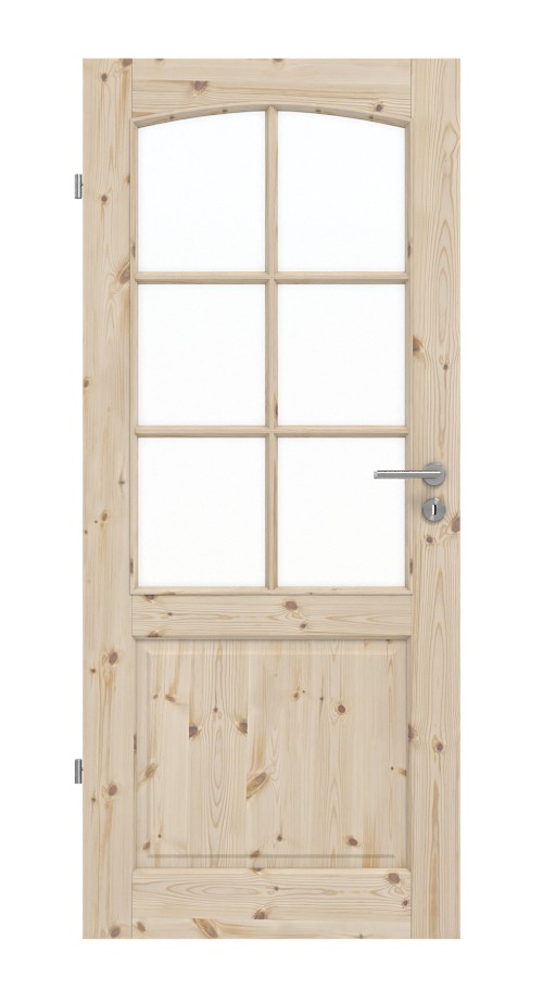 Skrzydło drzwiowe posiada duże przeszklenie z łukowatym wycięciem w górnej części. Drewniane szprosy dzielą wycięcie na sześć kwadratów. Profilowana listwa drzwiowa podkreśla tradycyjne wykończenie wizualne drzwi.